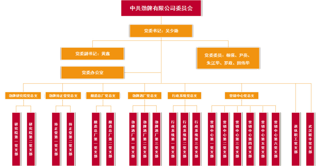 在各級黨組織的高度重視和親切的關懷下,勁牌有限公司的基層黨組織隨著企業的穩健發展而不斷壯大,1996年升格為黨委,2013年成立紀委;同時建立健全了工會、共青團、婦聯組織,配備了專兼職人員,形成了黨建工作齊抓共管的工作格局。目前,公司黨委下轄6個黨總支,共設20個黨支部。